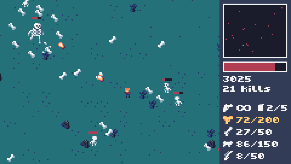 TIC-80's default controls are Z and X and the arrow keys, however I recommend remapping the arrow keys to wasd since this game uses mouse aiming. You can change weapons with the scroll wheel, so don't worry about mapping the other buttons. The goal is to survive as long as possible, with the enemy count and their bullet speed gradually increasing over time. Skellies will occasionally drop ammo, grenades, or health kits. Health kits are worth bonus points if you're at full health. Right clicking with throw a grenade, which will one shot any enemy in the game so save them for when you're in a pinch!